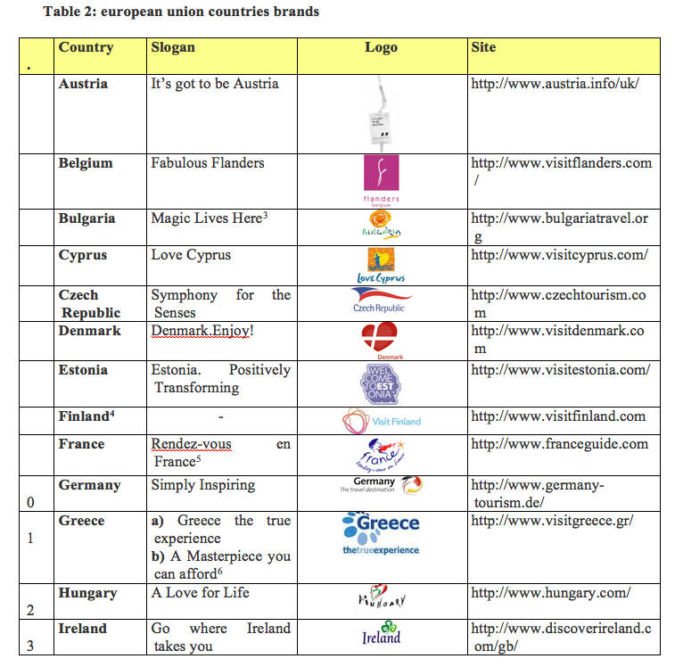 Key Words: tourism destinations, brand name, marketing, EU countries, logos.