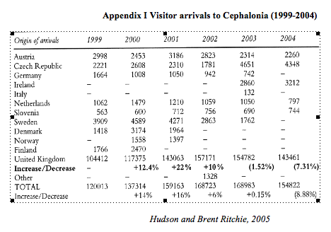 Even more significant was the rise in numbers from Britain specifically, with 2000 seeing a 12.4% increase and a 22% increase in 2001 (See appendix I).British tour operators took advantage of the film in order to promote the island as a tourist destination (Hudson & Ritchie, 2005). In addition, some internet sites listed Cephalonia and the settings filmed in the movie among the places of interest. But, since the film set was destroyed, there was not much left for visitors to satisfy their interests. Some entrepreneurs, nevertheless, took the opportunity to use the popularity of the film and established new businesses, giving them names inspired by the movie, such as “Captain Corelli’s Bar” (Moira, 2009).