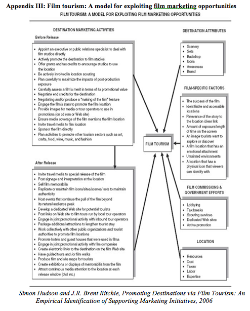 - Hudson, S., Brent Ritchie, J., Promoting Destinations via Film Tourism: An Empirical Identification of Supporting Marketing Initiatives (2006) Retrieved 10 March 2009.