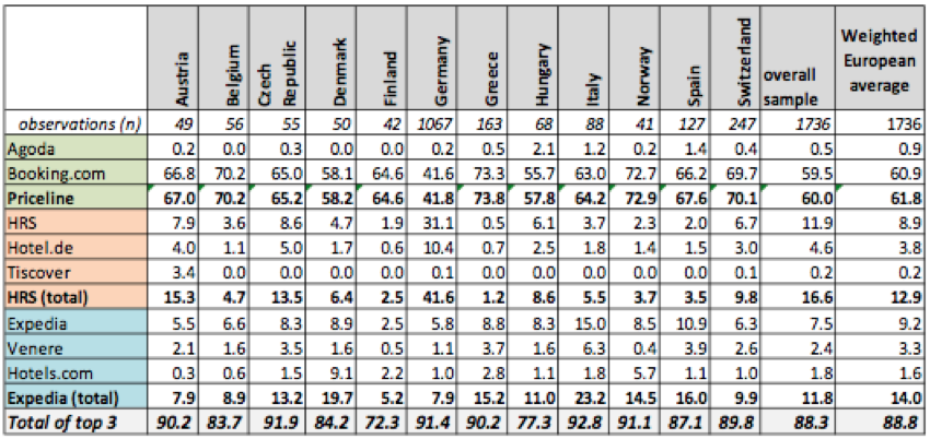 Table 4: Weighted market share of the 3 top OTAs in selected countries
