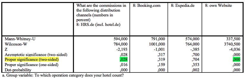 In the case of HRS, there is a significant difference between Individual, Cooperation (mean rank = 56.17) and Brand/Franchise/Chain (mean rank = 41.26) -> U = 594.00, p = 0,028. The commission rates of HRS are higher for Individual/Cooperation than for Brand/Franchise/Chain. There is a highly significant difference in the commission rates for your own website between cooperation, individual (mean ranking = 45.62) and Brand/Franchise/Chain (mean ranking = 72.75) ->U = 337.50, p =. 000. In summary, it should be noted that there is a significant difference for HRS between private/cooperation and Brand/Franchise/Chain. This cannot be uniquely attested for the booking. com (p=0.319). The significant difference (p=0,000) with the own hotel website is also well understandable, because private hotels usually only pay very low commission fees (or even nothing) to the Internet Booking Engine agency of their website. In contrast all chain hotels usually pay a higher commission at their parent company for a reservation over the own brand website.