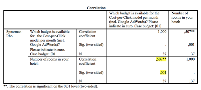 Our study shows that budget increases with the increasing number of rooms. It can be seen that there is a highly significant correlation between the budget and the number of rooms with r =.51, p =.001. The effect of the correlation is very strong with r =.51. If the size of a hotel determines the expenditure for pay per click models, the question arises whether this also applies to hotels with high turnover, i.e. whether there is a correlation between the turnover of a hotel and the budget for cost-per-click models?