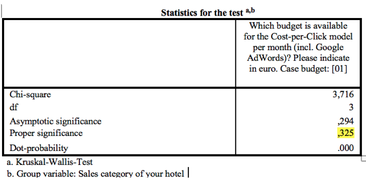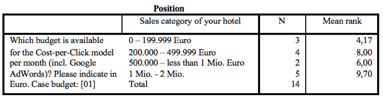 There are no significant group differences with respect to the budget Chi-square (3) = 3,716, p =. 325. Thus it can be stated that the turnover of a hotel has no influence on how much the hotels spend on cost-per-click models per month and the hypothesis 3 cannot be proven.